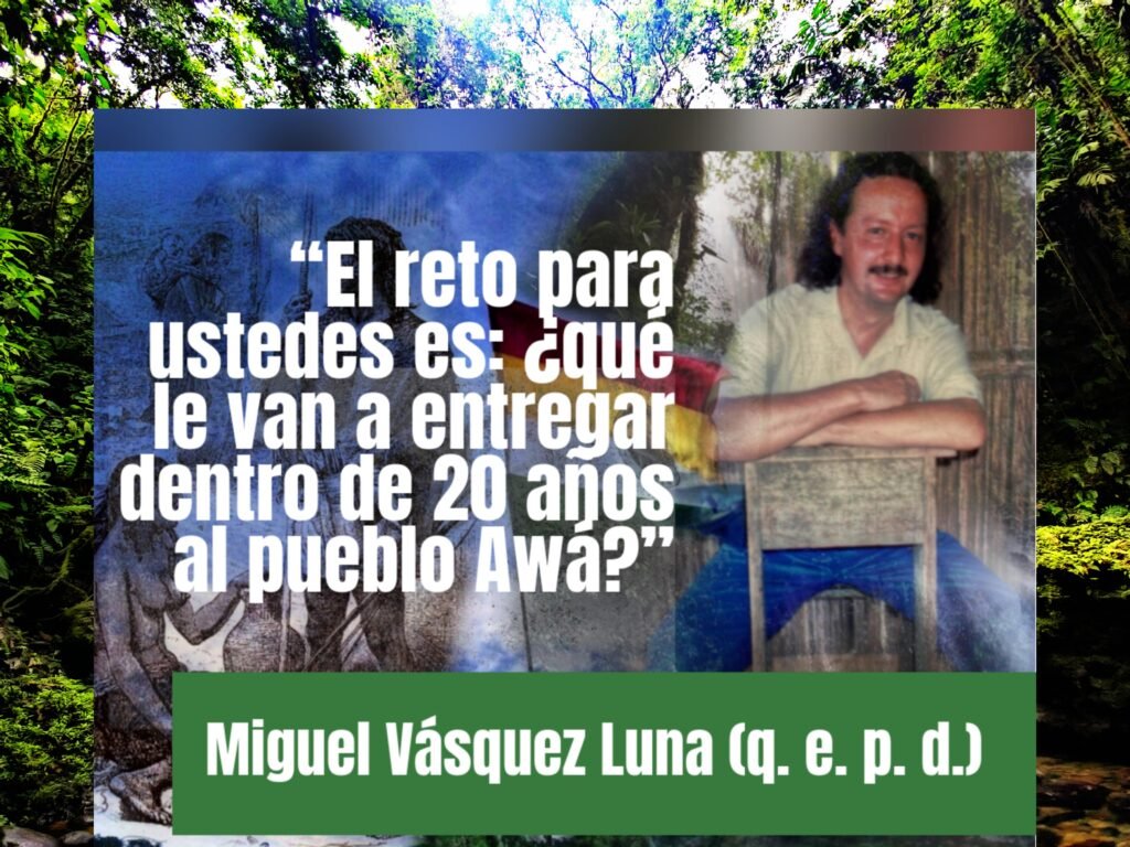 Hoy, 8 de septiembre, conmemoramos doce años de la partida de Miguel Vásquez Luna (q. e. p. d.), abogado, consejero y mayor que guió con palabra y ejemplo al pueblo Awá. Su voz permanece viva en la memoria de las mayoras, de los mayores, de la juventud y de la comunidad en general, porque supo sembrar conciencia, dignidad y organización.